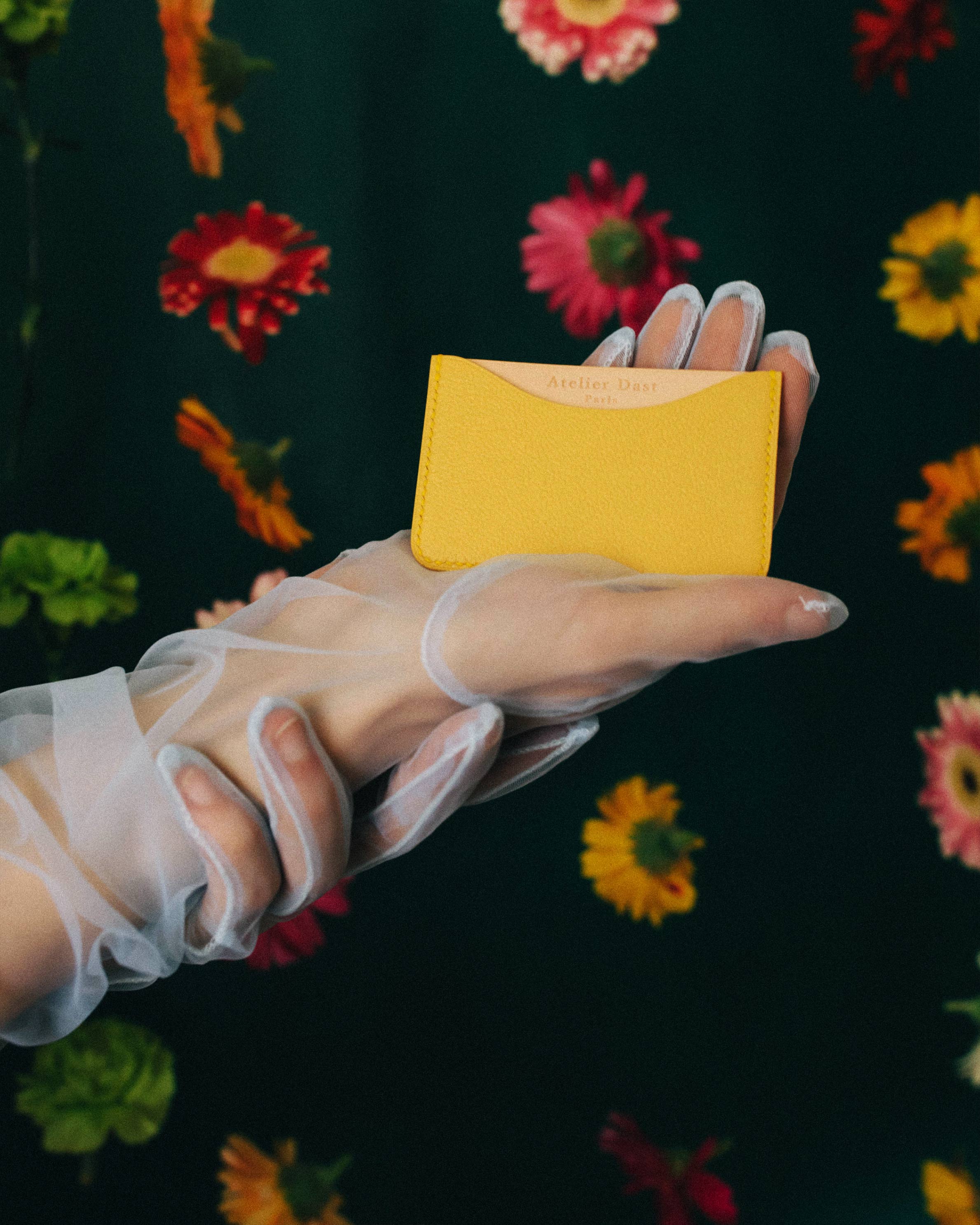 Charm Signature couleur jaune mimosa réalisé par notre artisan sellier-maroquinier dans notre atelier près de Paris. Le modèle est entièrement confectionné en cuir de chèvre pleine fleur en provenance de notre fournisseur français. Fermeture à bouton-pression.