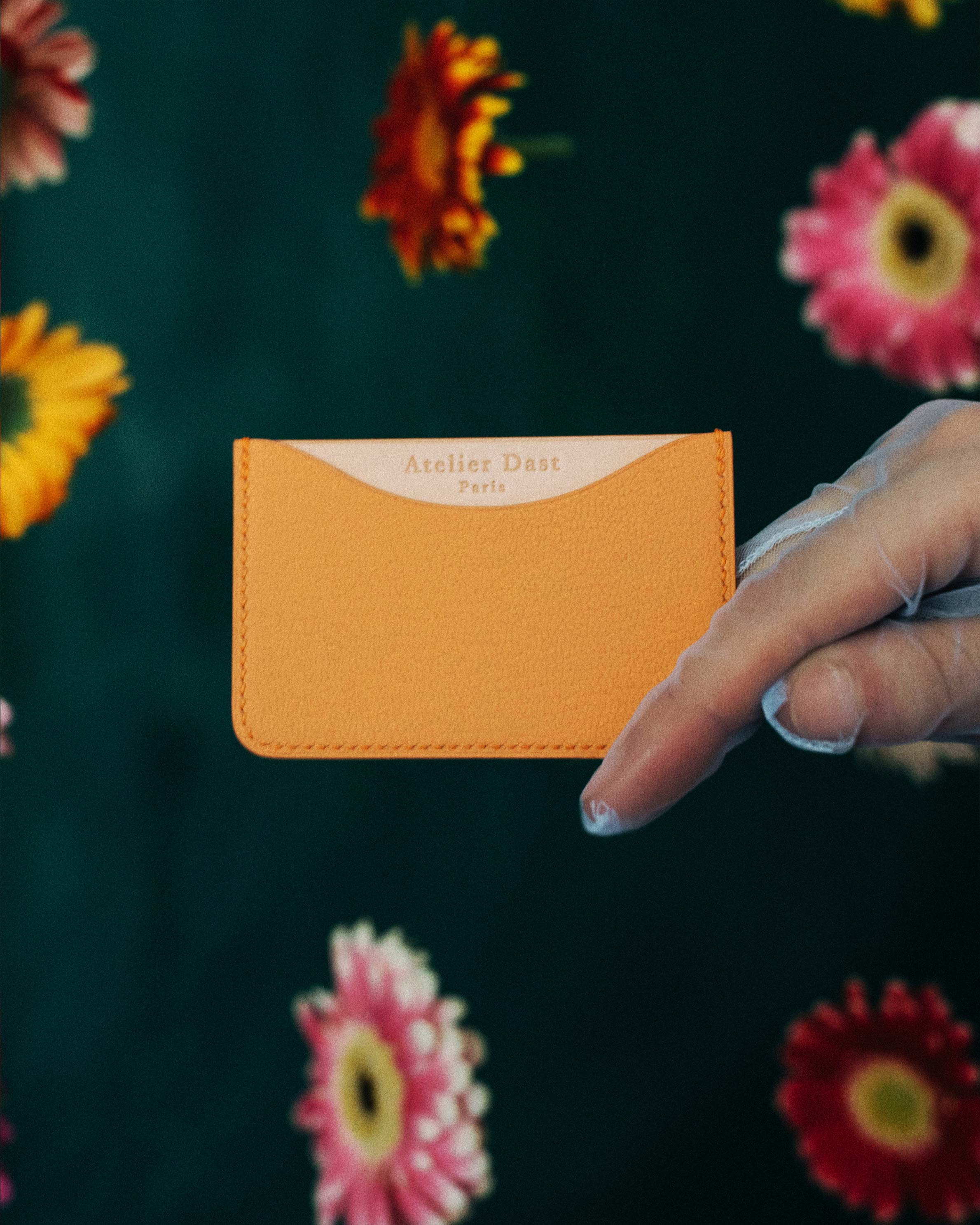 Orange dahlia #1 Edition card case handcrafted by our saddler-leather craftsman in our workshop near Paris. Leathers used for this model are a full-grain goatskin on the outside and a natural cowhide, full-grain and vegetable-tanned, on the inside coming from our suppliers based in France.
