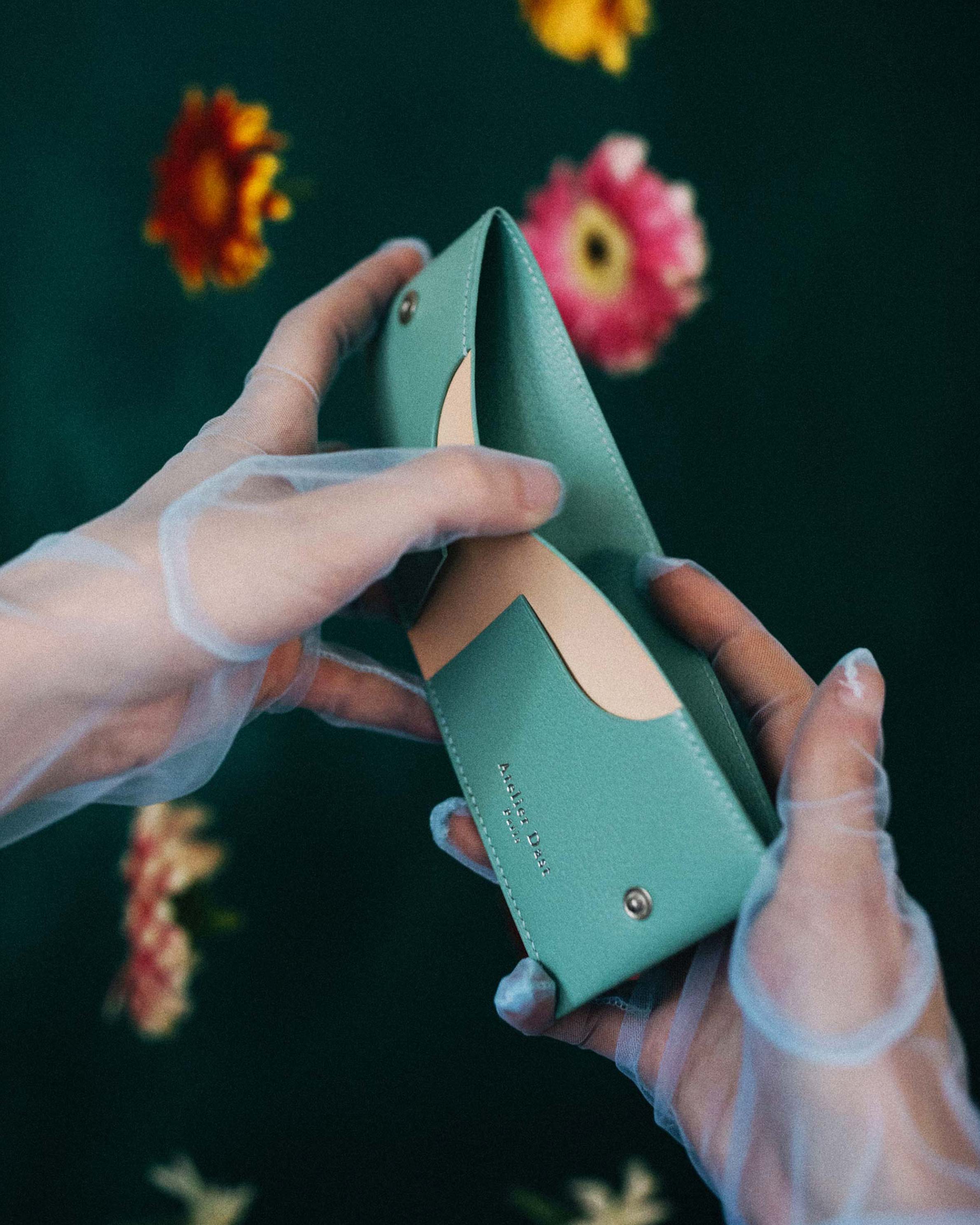 Orange dahlia #1 Edition card holder handcrafted by our saddler-leather craftsman in our workshop near Paris. Leathers used for this model are a full-grain goatskin on the outside and a natural cowhide, full-grain and vegetable-tanned, on the inside coming from our suppliers based in France. Snap button closure.