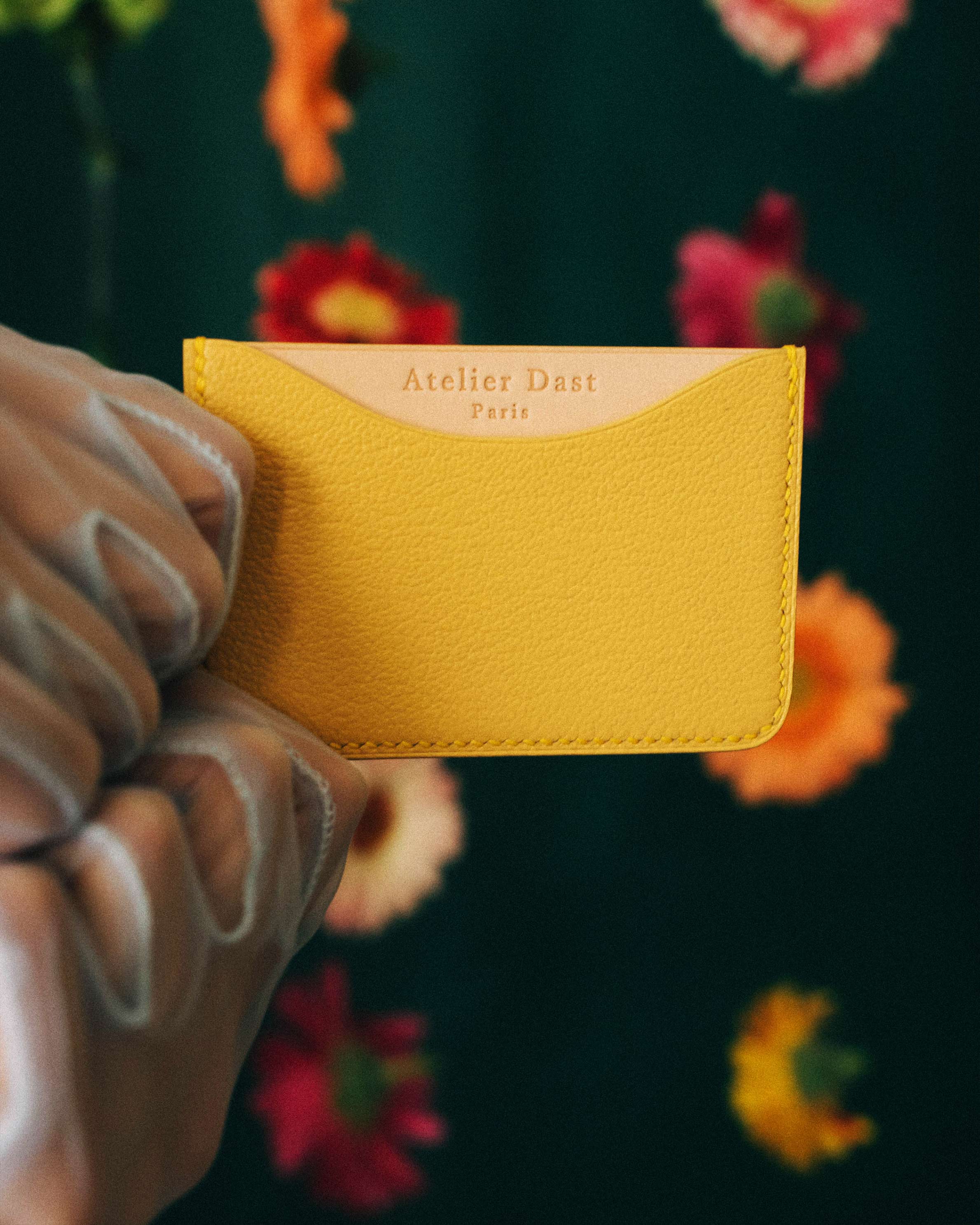 Mimosa yellow #1 Edition card case handcrafted by our saddler-leather craftsman in our workshop near Paris. Leathers used for this model are a full-grain goatskin on the outside and a natural cowhide, full-grain and vegetable-tanned, on the inside coming from our suppliers based in France.