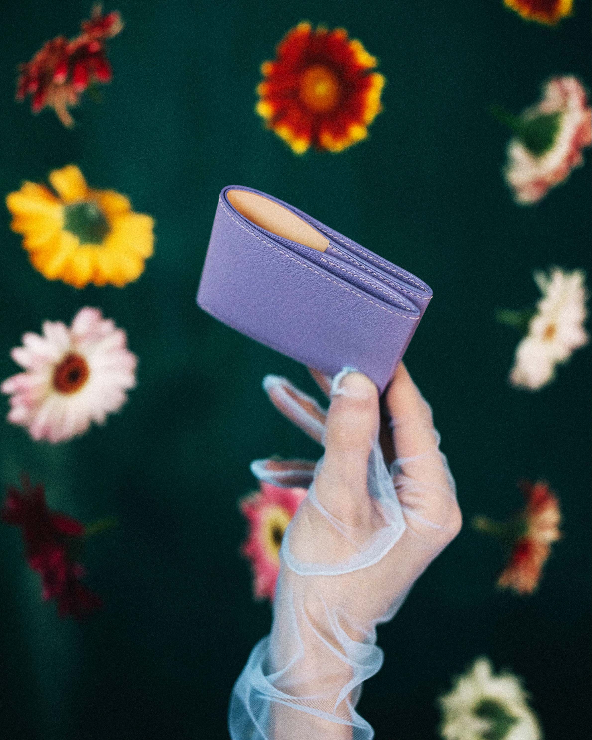 Lavender #1 Edition card holder handcrafted by our saddler-leather craftsman in our workshop near Paris. Leathers used for this model are a full-grain goatskin on the outside and a natural cowhide, full-grain and vegetable-tanned, on the inside coming from our suppliers based in France. Snap button closure.