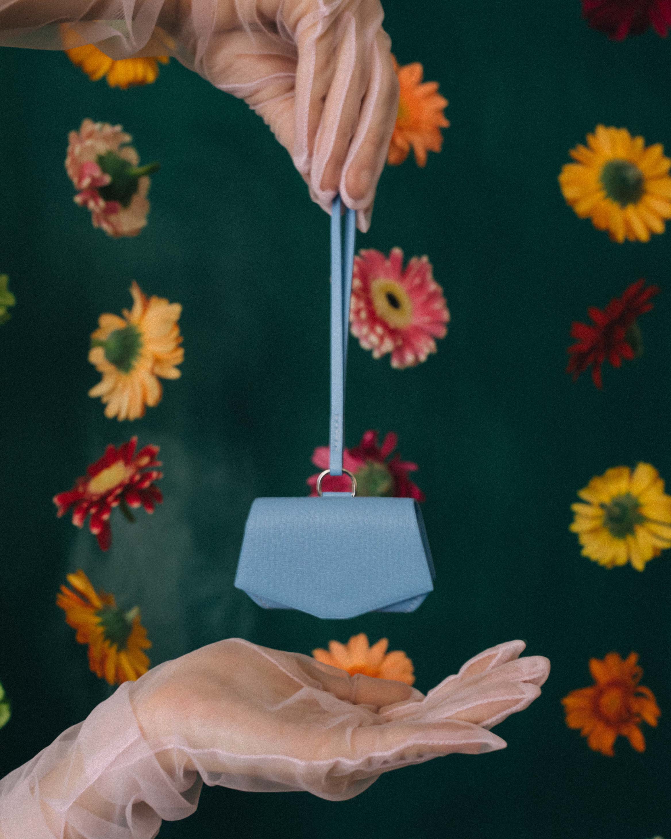 Sky blue Signature charm handcrafted by our saddler-leather craftsman in our workshop near Paris. The leather used for this model is a full-grain goatskin coming from our supplier based in France. Snap button closure.