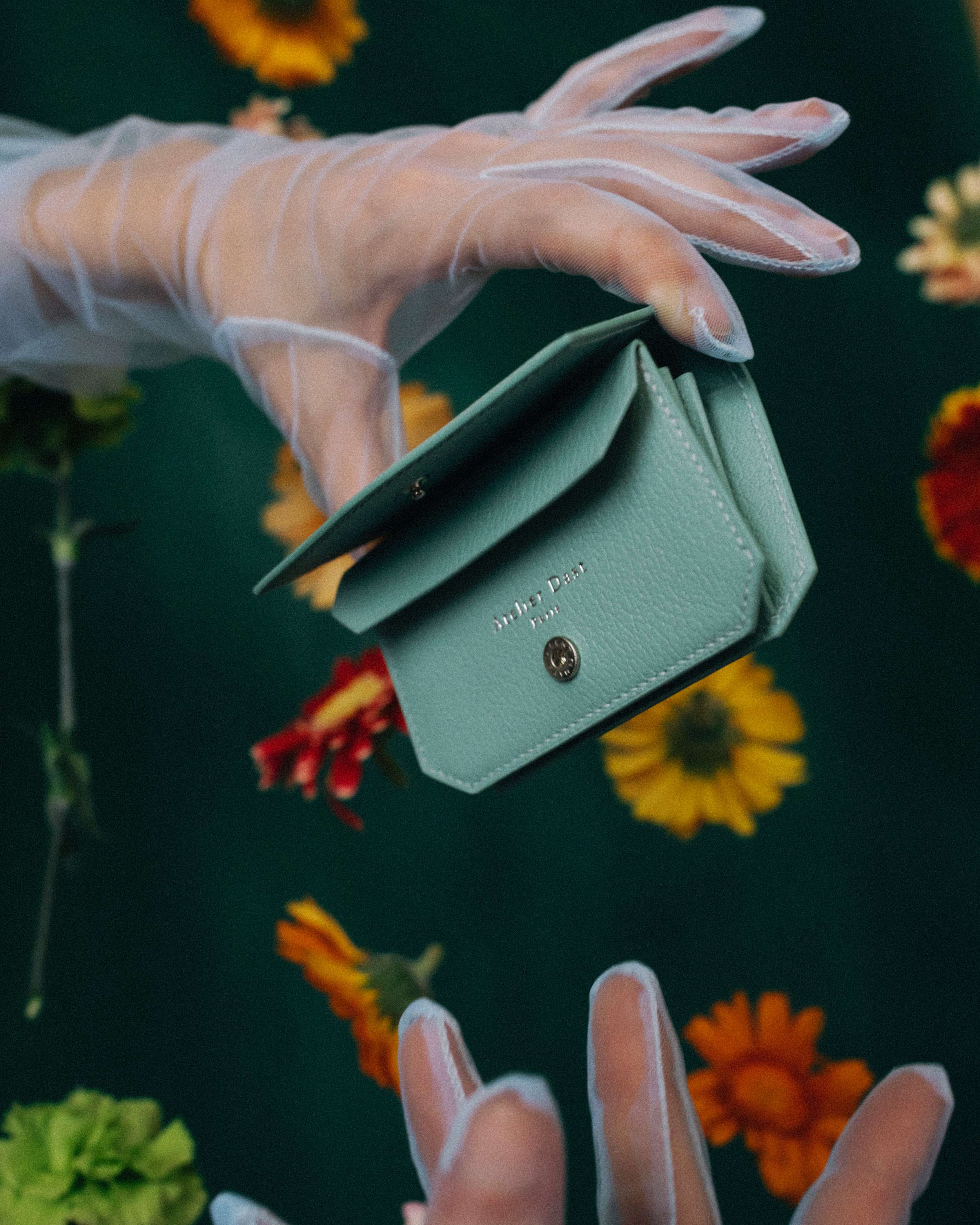Mint green Signature coin purse handcrafted by our saddler-leather craftsman in our workshop near Paris. Leathers used for this model are a full-grain goatskin on the outside and a natural cowhide, full-grain and vegetable-tanned, on the inside coming from our suppliers based in France. Snap button closure.
