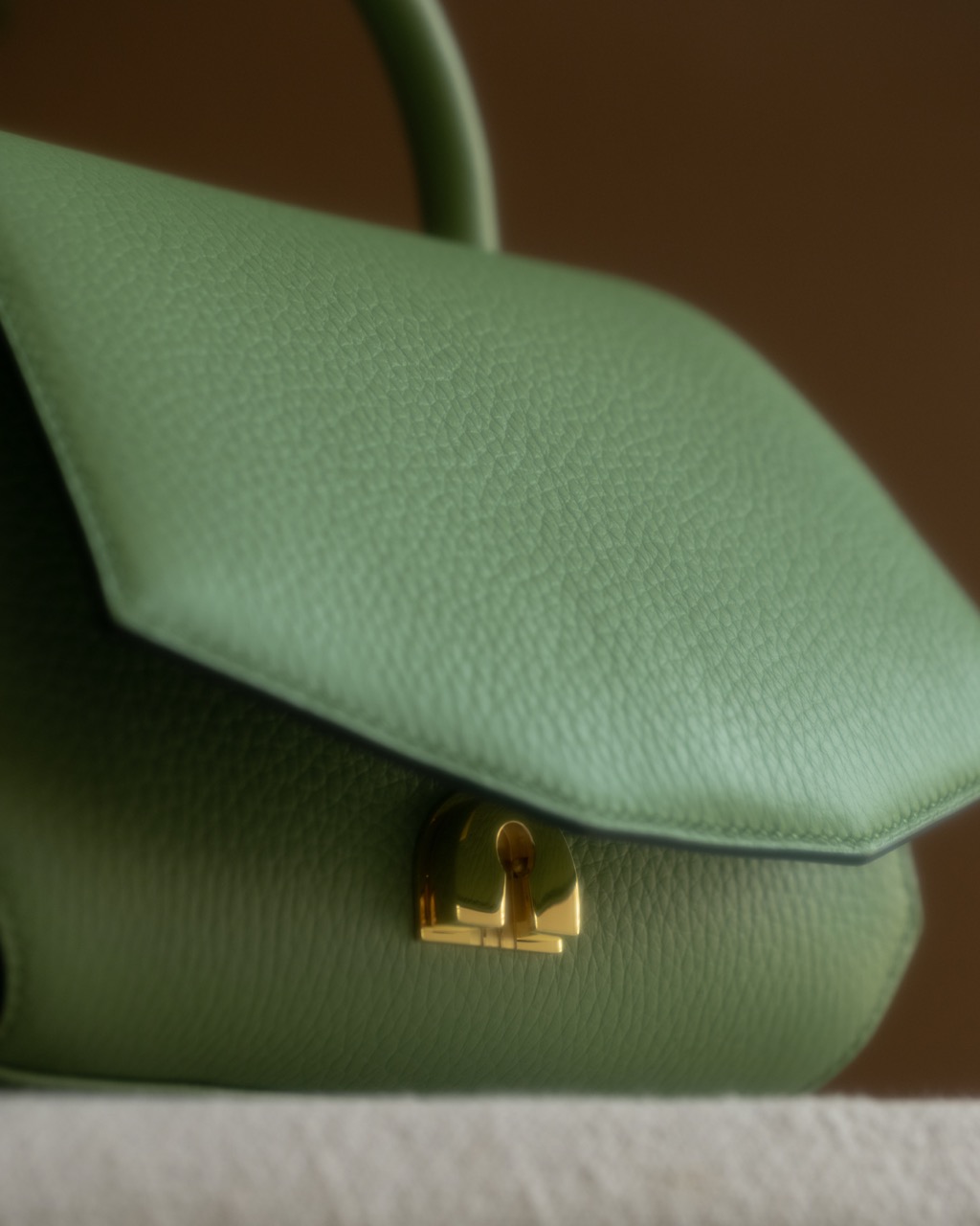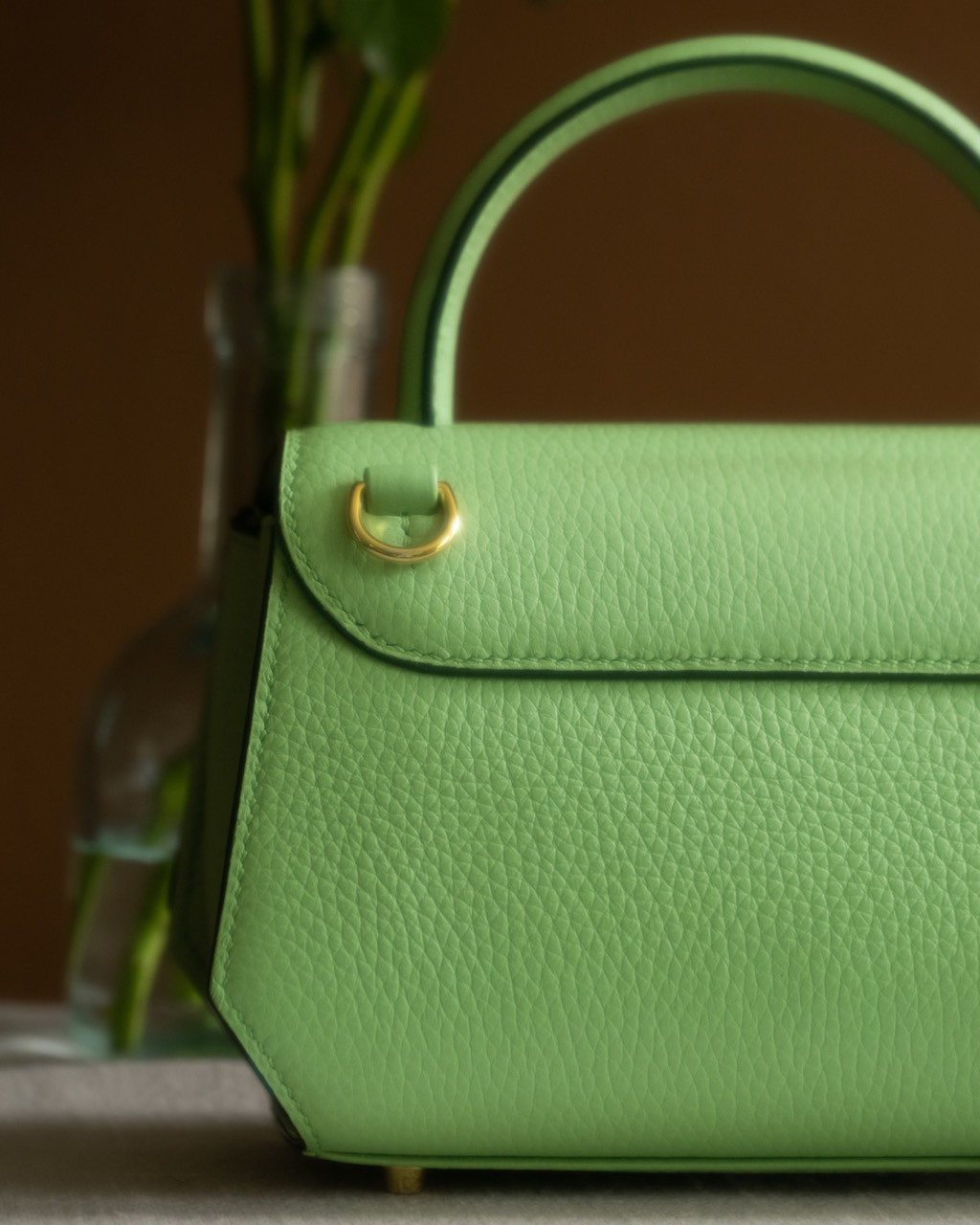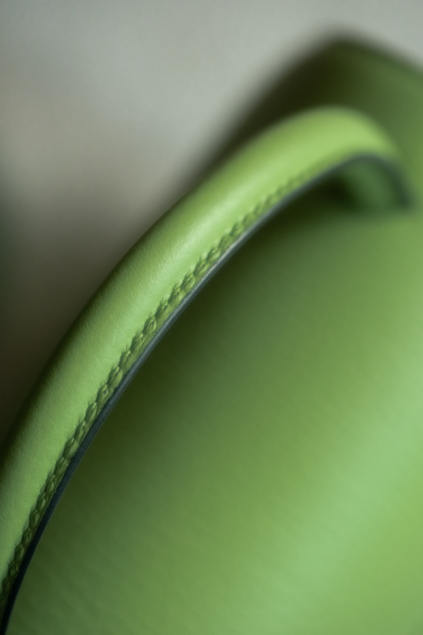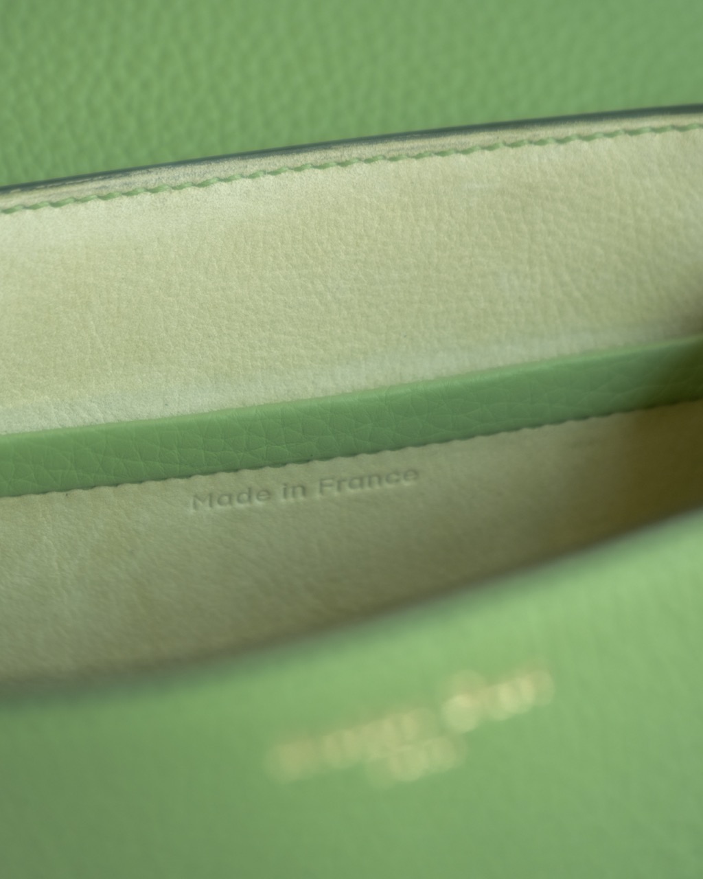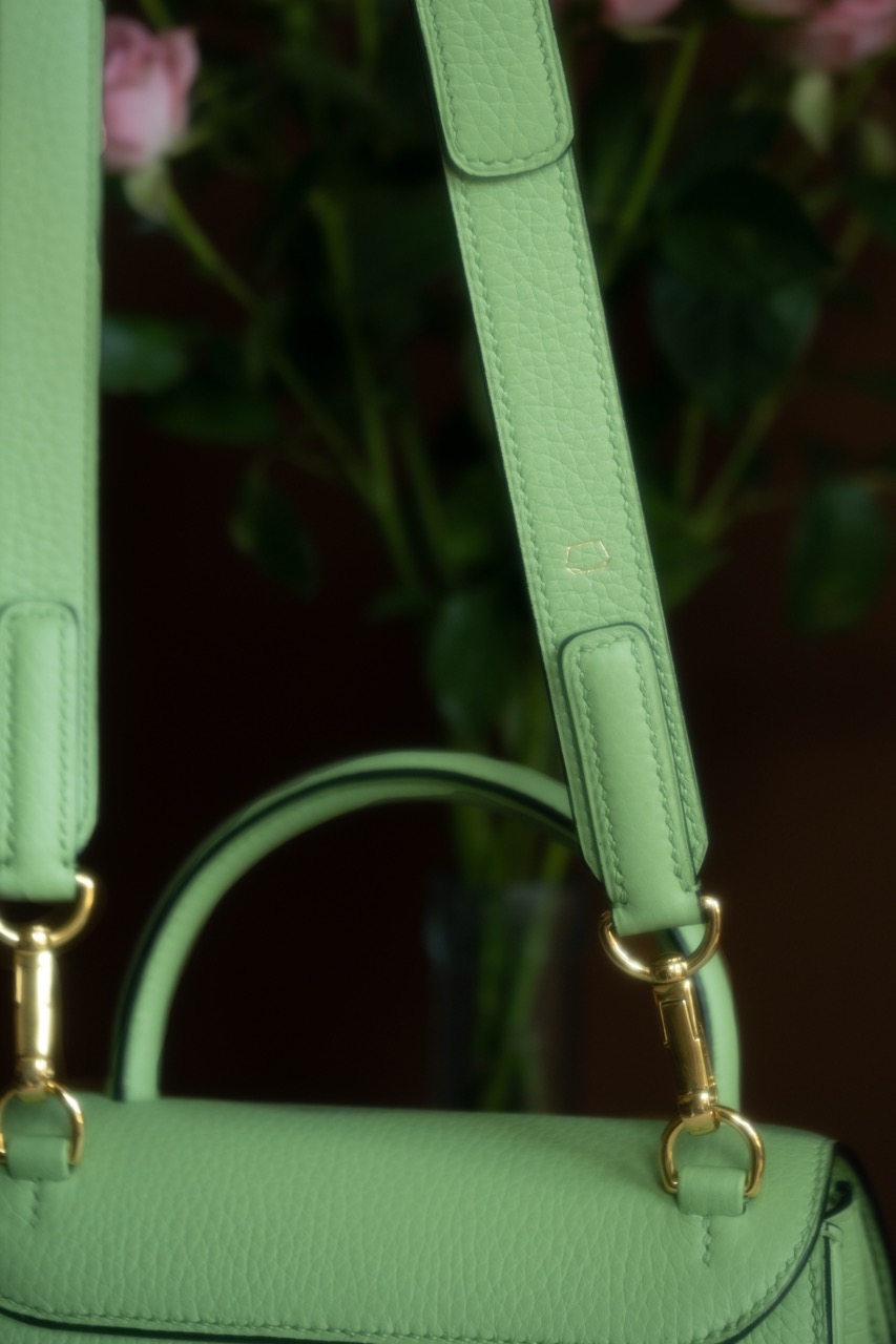 Mini-Sac Signature couleur vert pomme réalisé par notre artisan sellier-maroquinier dans notre atelier près de Paris. L’extérieur du modèle est en cuir de taurillon pleine fleur semi-aniline et l’intérieur est en cuir de taurillon nubuck, en provenance de nos fournisseurs français. Fermoir bijou siglé de la ligne Signature.